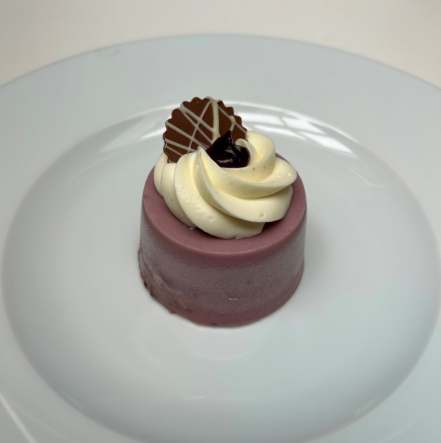 Brownie med lys sirup, hvid chokolade, feuilletine og solbærganache
